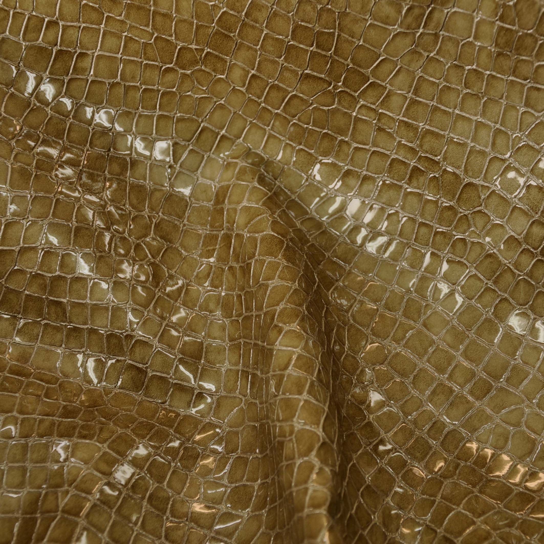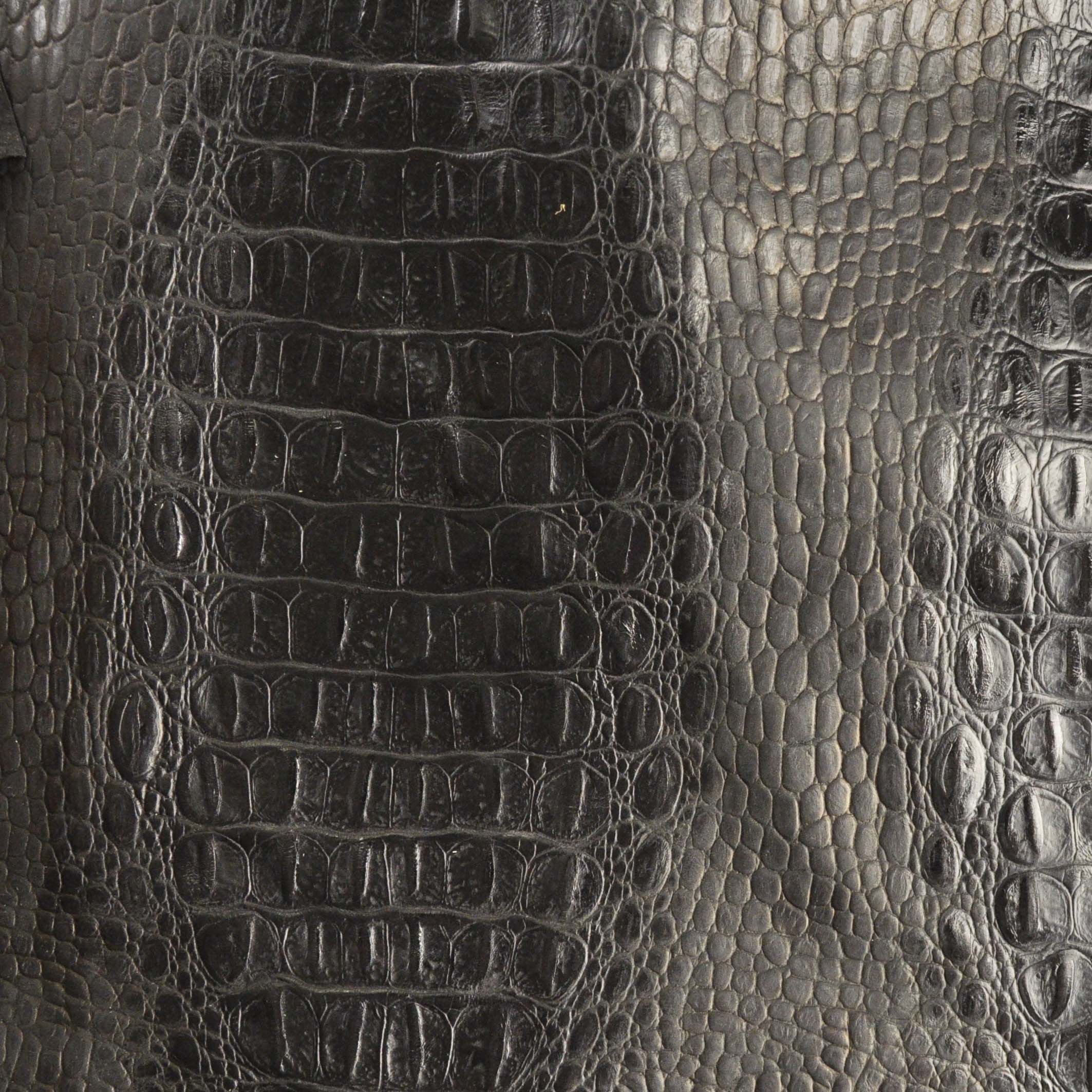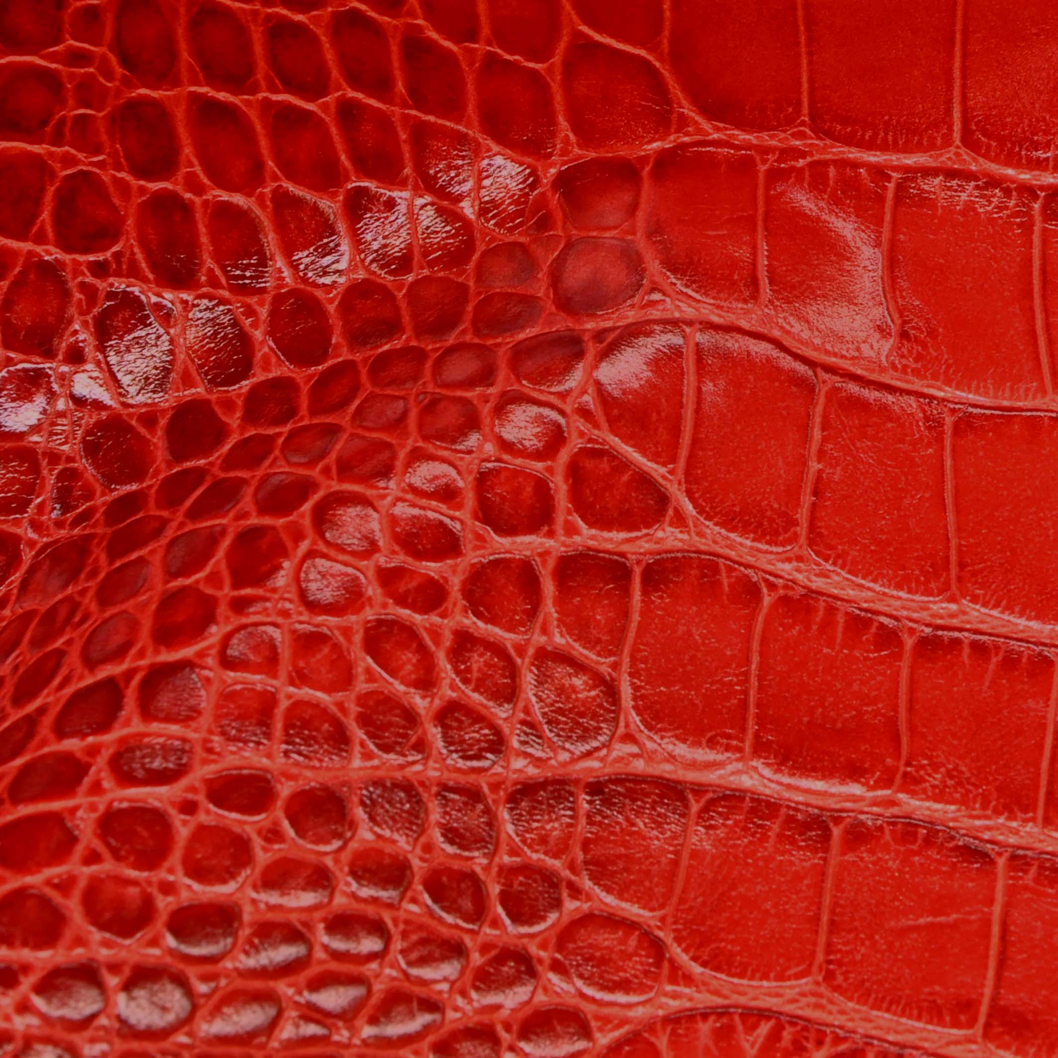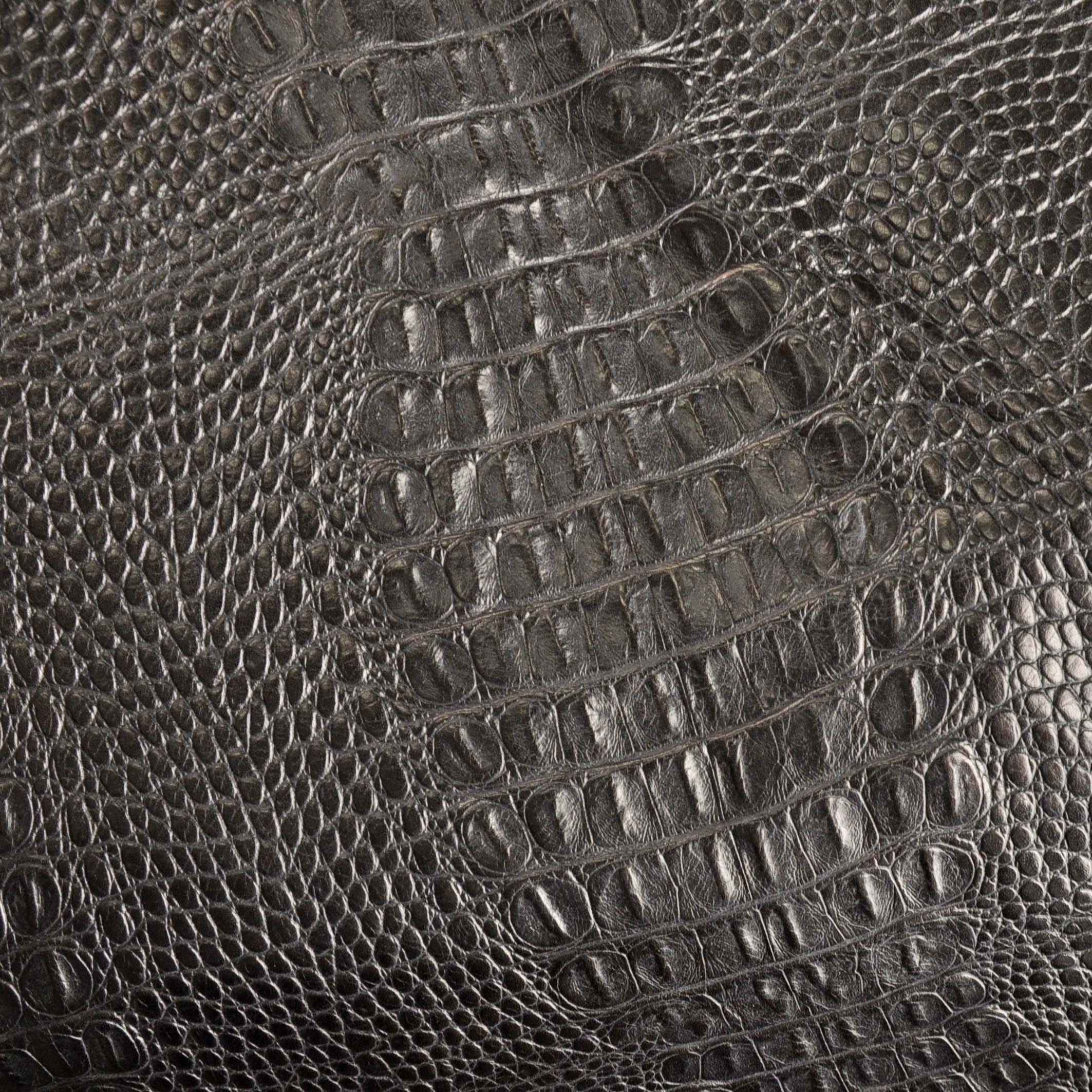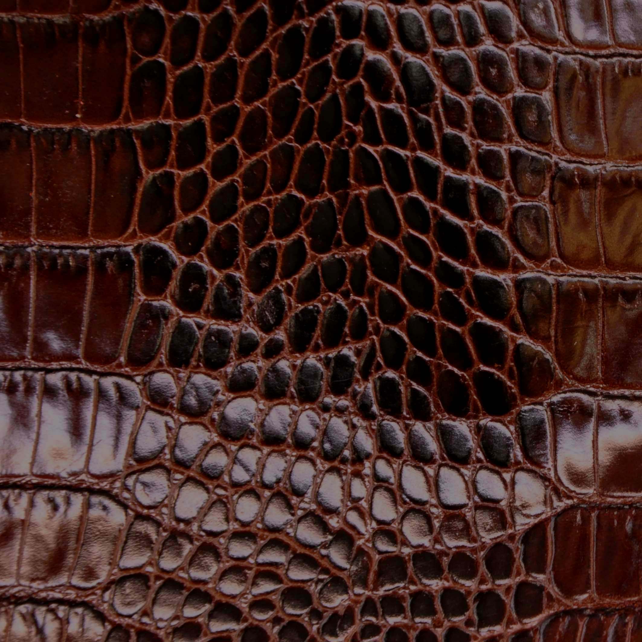 - Finom fogású, fényes,lakk felületű, nem monogrammozható, kiemelkedően kopásálló, krokodilmintás, márványosan foltosra színezett, nagyonsötétbarna színű valódi bőr.